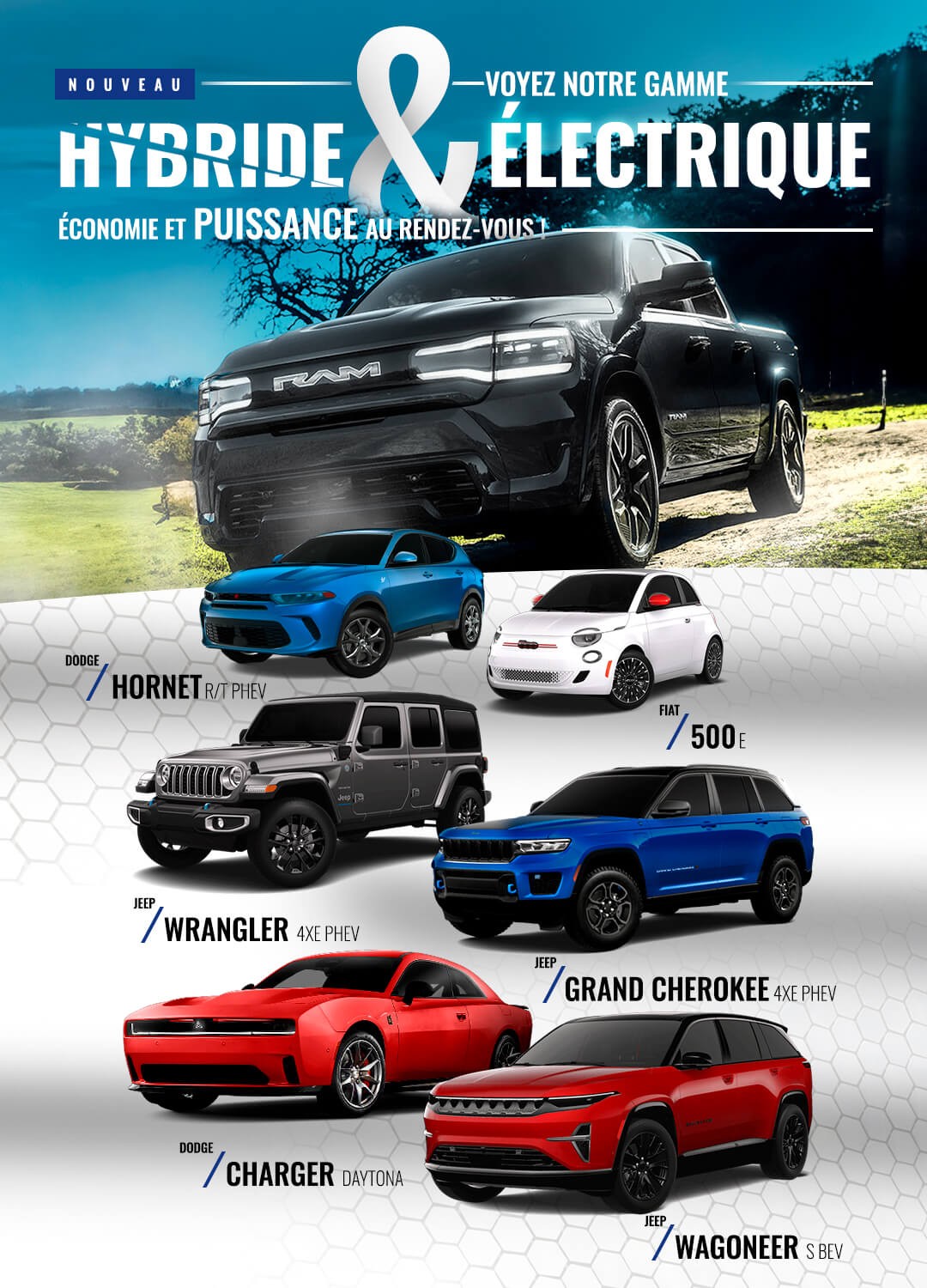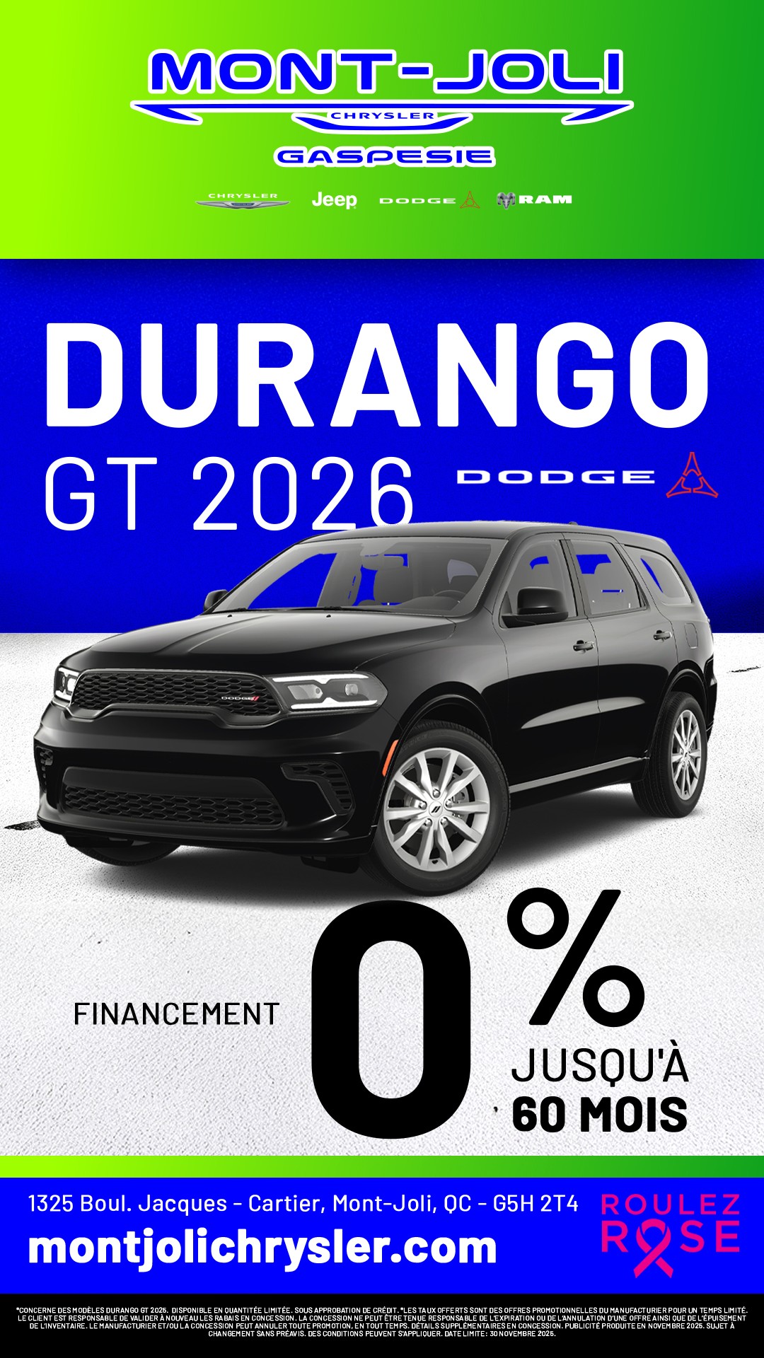 À la recherche d'offres imbattables sur les véhicules Chrysler, Jeep, RAM et Dodge? Ne cherchez pas plus loin! Chez Mont-Joli Chrysler, nous sommes fiers de vous proposer des promotions exceptionnelles sur toute la gamme de véhicules Chrysler, Jeep, RAM et Dodge. Que vous soyez intéressé par une berline élégante, un puissant camion 4x4, un VUS spacieux ou un véhicule utilitaire robuste, nos offres spéciales sont conçues pour vous offrir un rapport qualité-prix inégalé. Nos promotions en cours vous permettent d'économiser gros sur l'achat d'un véhicule Chrysler, Jeep, RAM et Dodge neuf ou d'occasion. Profitez de rabais exceptionnels, de taux de financement avantageux et d'incitatifs uniques qui rendent l'acquisition de votre véhicule Chrysler, Jeep, RAM et Dodgeencore plus attrayante. Notre équipe dévouée est là pour vous guider à travers toutes les promotions disponibles, afin de vous assurer de tirer le meilleur parti de votre investissement automobile. Que vous soyez un passionné de la performance, de la technologie, de la sécurité ou du style, les véhicules Chrysler, Jeep, RAM et Dodge offrent une gamme diversifiée de modèles qui répondront à toutes vos attentes. Ne manquez pas l'opportunité de posséder un véhicule Stellantis de qualité supérieure tout en profitant d'offres exceptionnelles. Visitez-nous dès aujourd'hui chez Mont-Joli Chrysler pour découvrir nos promotions en cours et pour faire l'essai de ces incroyables véhicules Stellantis. Ne laissez pas passer cette occasion de conduire avec style, performance et fiabilité, le tout à des prix avantageux. Chez nous, vous êtes sûr de trouver la meilleure offre sur votre prochain véhicule Chrysler, Jeep, RAM et Dodge. Rendez-vous chez Mont-Joli Chrysler et économisez gros sur votre achat automobile!