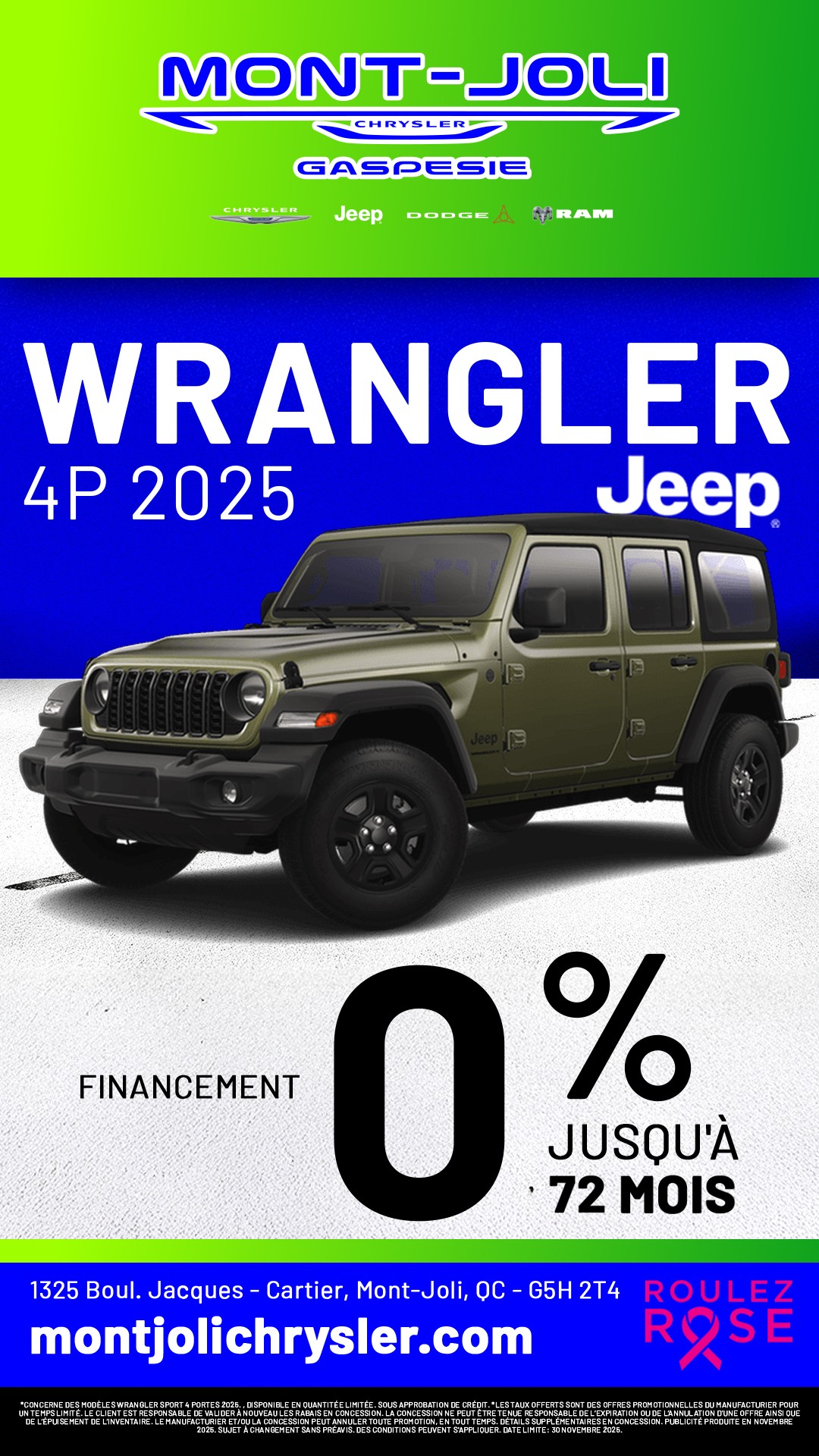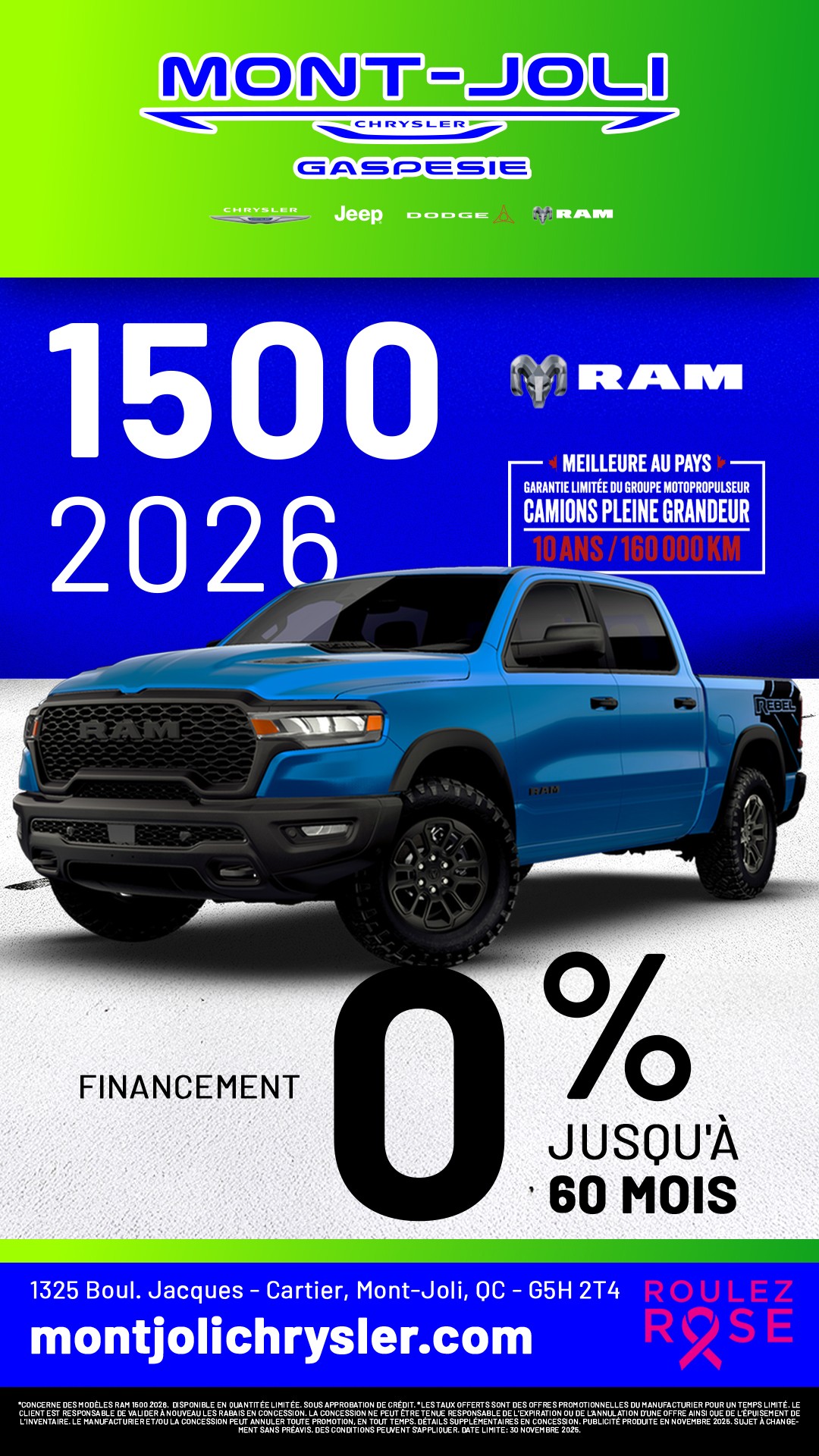 De plus, renseignez-vous sur les différentes options de [financement](https://www.montjolichrysler.com/financement/) et nos [promotions](https://www.montjolichrysler.com/promotions-du-mois/) en cours chez votre concessionnaire Ram, Dodge, Chrysler et Jeep !