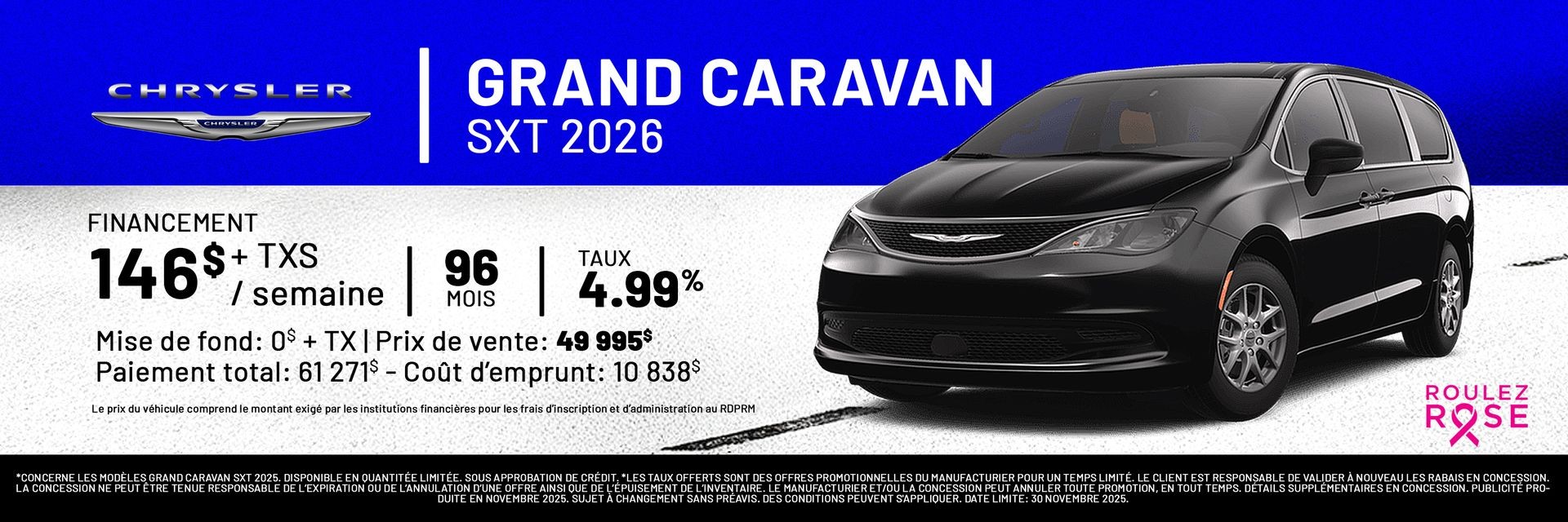 Votre concessionnaire près de Rimouski vous propose la gamme complète de minifourgonnettes Chrysler, à savoir **les Grand Caravan** et **les Pacifica**, ces dernières se déclinant en **versions à essence et hybrides rechargeables.** En plus de notre [inventaire neuf Chrysler,](https://www.montjolichrysler.com/inventaire-neuf/?brand=Chrysler&orderBy=ASC&transactionType=loan) vous trouverez chez Mont-Joli Chrysler plusieurs [véhicules Chrysler d’occasion](https://www.montjolichrysler.com/auto-usage/chrysler/), dont des Pacifica de même que des Chrysler 300, pour ne nommer que celles-là.
