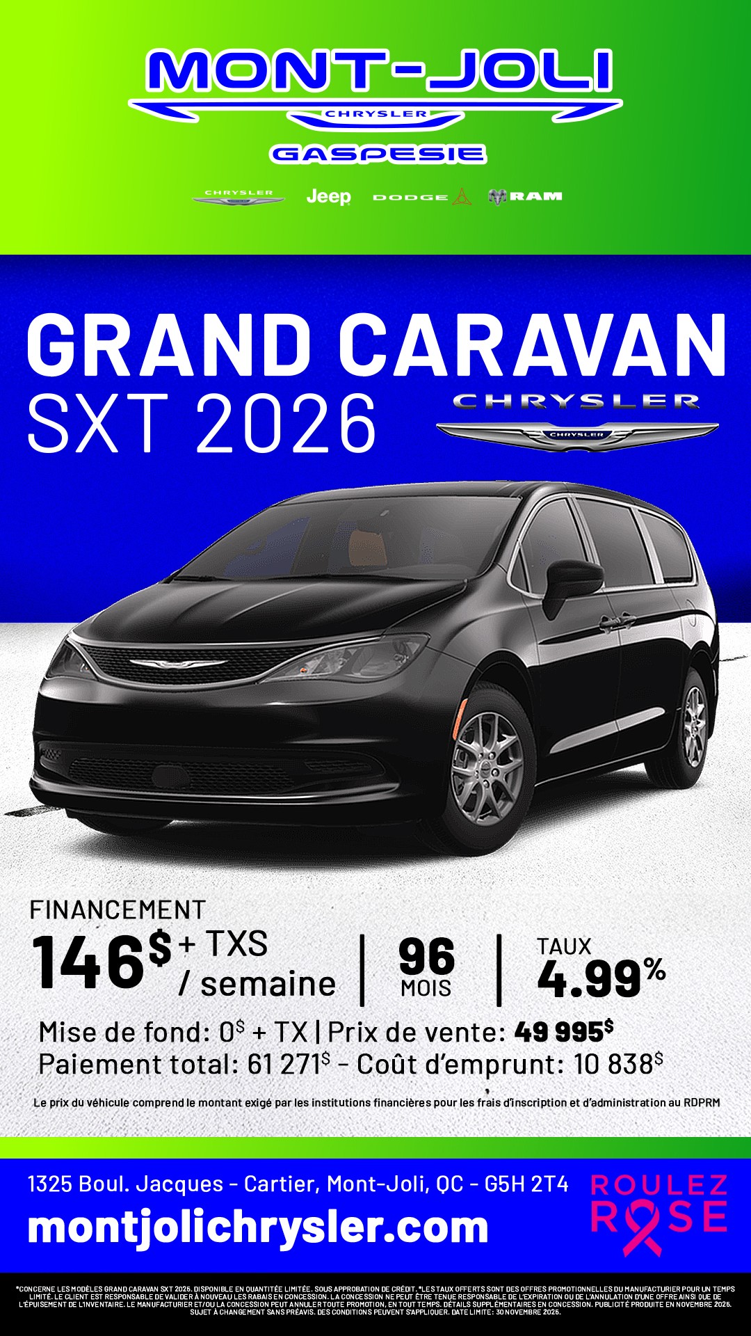 Votre concessionnaire près de Rimouski vous propose la gamme complète de minifourgonnettes Chrysler, à savoir **les Grand Caravan** et **les Pacifica**, ces dernières se déclinant en **versions à essence et hybrides rechargeables.** En plus de notre [inventaire neuf Chrysler,](https://www.montjolichrysler.com/inventaire-neuf/?brand=Chrysler&orderBy=ASC&transactionType=loan) vous trouverez chez Mont-Joli Chrysler plusieurs [véhicules Chrysler d’occasion](https://www.montjolichrysler.com/auto-usage/chrysler/), dont des Pacifica de même que des Chrysler 300, pour ne nommer que celles-là.