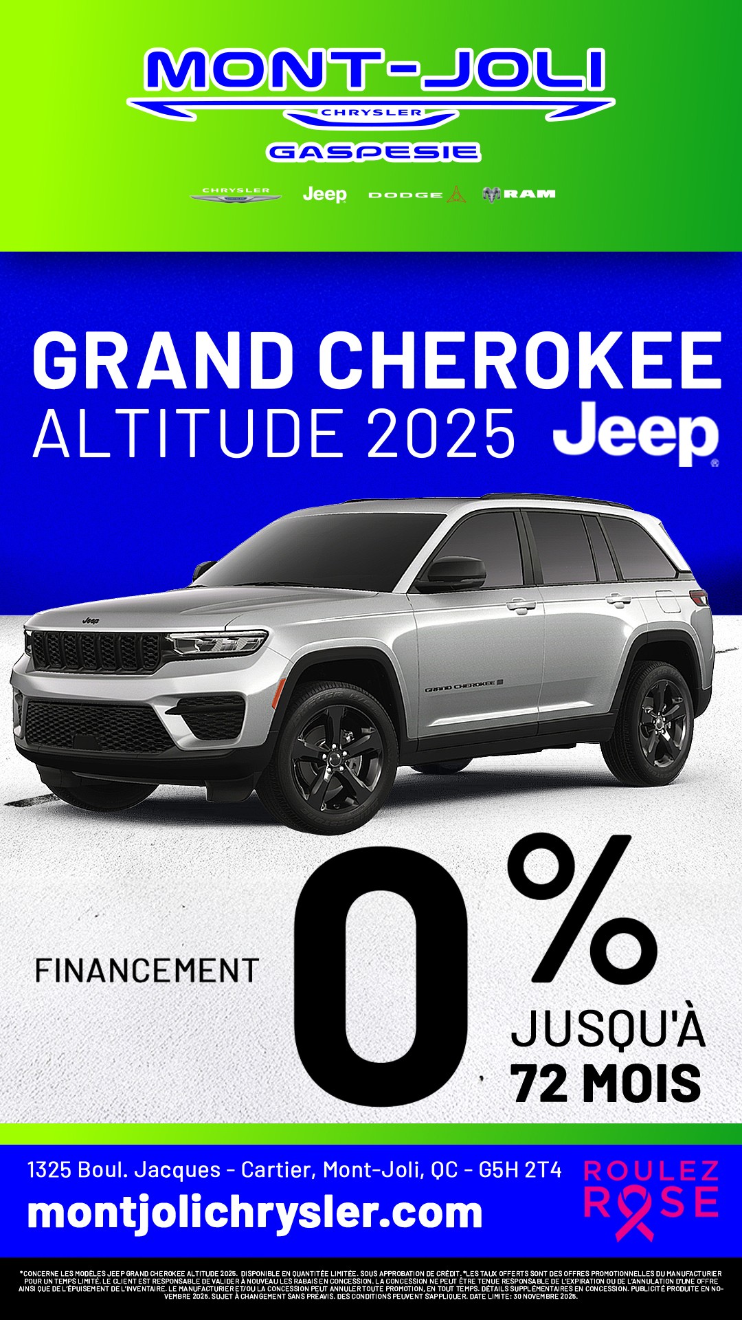 La saison estivale arrive à grands pas et vous souhaitez un VUS adapté à la conduite hors route ? vous trouverez chez Mont-Joli Chrysler, votre concessionnaire Jeep #1 dans la région, toute la gamme de VUS Jeep incluant les emblématiques **Wrangler — à essence ou rechargeables** — les luxueux **Grand Cherokee** ou encore les **camionnettes Gladiator**, entre autres.