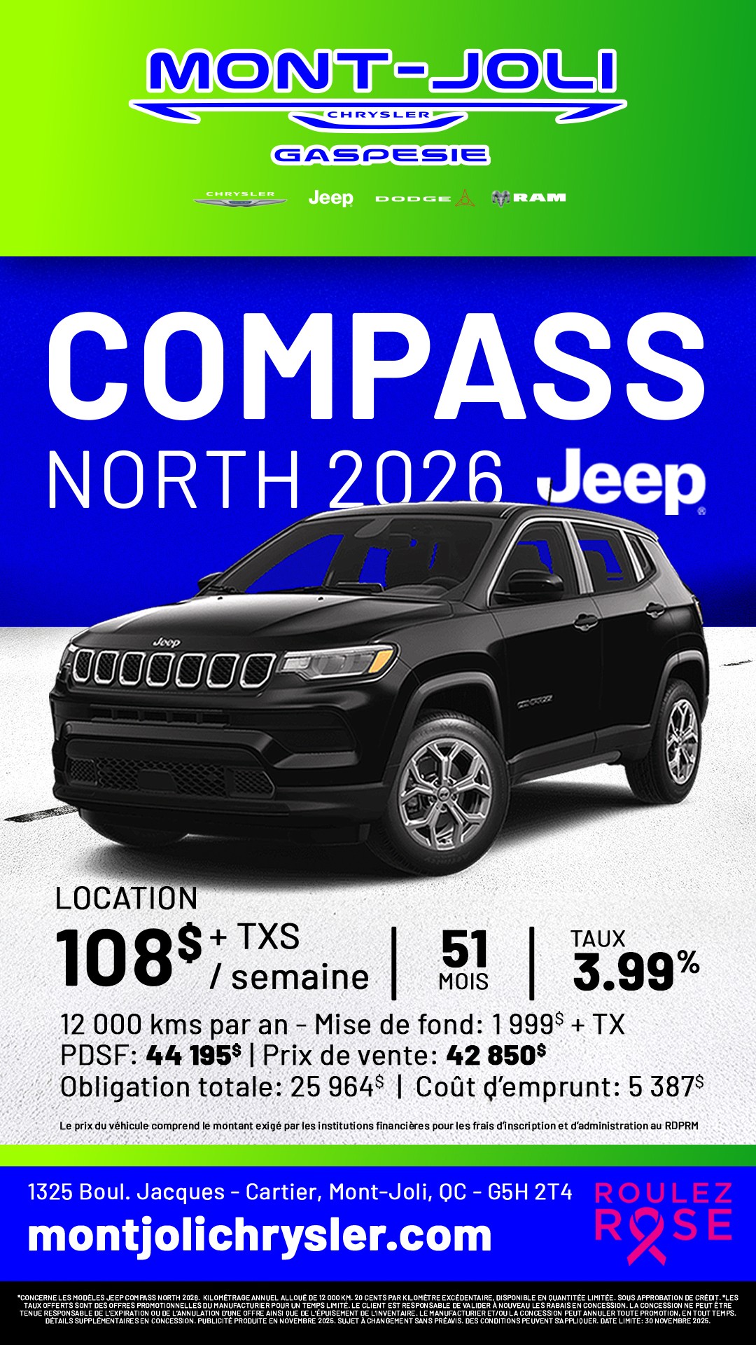 À la recherche d'offres imbattables sur les véhicules Chrysler, Jeep, RAM et Dodge? Ne cherchez pas plus loin! Chez Mont-Joli Chrysler, nous sommes fiers de vous proposer des promotions exceptionnelles sur toute la gamme de véhicules Chrysler, Jeep, RAM et Dodge. Que vous soyez intéressé par une berline élégante, un puissant camion 4x4, un VUS spacieux ou un véhicule utilitaire robuste, nos offres spéciales sont conçues pour vous offrir un rapport qualité-prix inégalé. Nos promotions en cours vous permettent d'économiser gros sur l'achat d'un véhicule Chrysler, Jeep, RAM et Dodge neuf ou d'occasion. Profitez de rabais exceptionnels, de taux de financement avantageux et d'incitatifs uniques qui rendent l'acquisition de votre véhicule Chrysler, Jeep, RAM et Dodgeencore plus attrayante. Notre équipe dévouée est là pour vous guider à travers toutes les promotions disponibles, afin de vous assurer de tirer le meilleur parti de votre investissement automobile. Que vous soyez un passionné de la performance, de la technologie, de la sécurité ou du style, les véhicules Chrysler, Jeep, RAM et Dodge offrent une gamme diversifiée de modèles qui répondront à toutes vos attentes. Ne manquez pas l'opportunité de posséder un véhicule Stellantis de qualité supérieure tout en profitant d'offres exceptionnelles. Visitez-nous dès aujourd'hui chez Mont-Joli Chrysler pour découvrir nos promotions en cours et pour faire l'essai de ces incroyables véhicules Stellantis. Ne laissez pas passer cette occasion de conduire avec style, performance et fiabilité, le tout à des prix avantageux. Chez nous, vous êtes sûr de trouver la meilleure offre sur votre prochain véhicule Chrysler, Jeep, RAM et Dodge. Rendez-vous chez Mont-Joli Chrysler et économisez gros sur votre achat automobile!